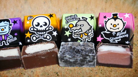 ガイコツさんはビスケット、狼男はホワイトチョコの中にチョコビス、ドラキュラはストロベリー味。
