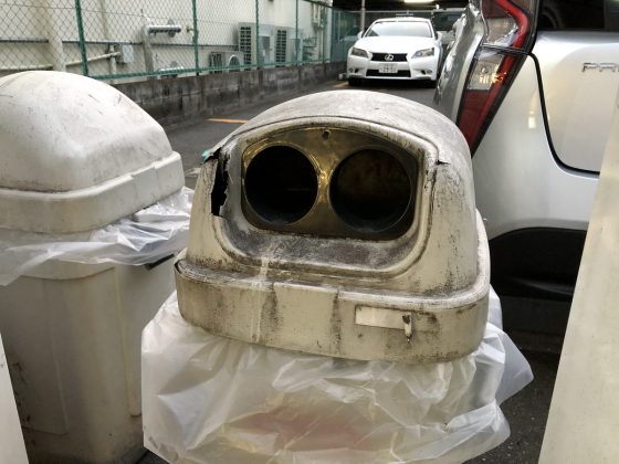 年末も差し迫った寒空のもと、駐車場の自販機に挟まれて佇む見慣れないゴミ箱さん。
