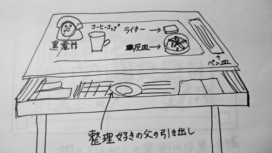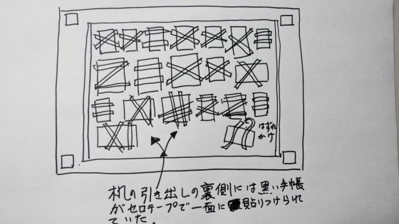 几帳面な父は自分の机の上も机の中も常に綺麗に整理している。ある日のこと、机の上を雑巾で拭こうとした母が引き出しが少し空いていたので閉めようとしただ何かがつかえて閉まらなかったのである。何がひかかっているのか見ようとして引き出しを引っ張ったら、机の裏側から黒い手帖がテープでぶら下がったまま出てきた。