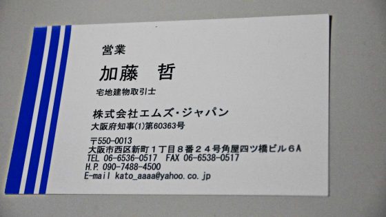 唯一いただいたエムズジャパンのの名刺。未だに日新プランニングの名刺は一枚も貰っていない。以下は、GIGAZINEの社員の報告である。