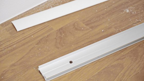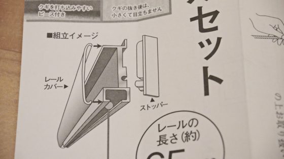 コーナンのレールは先に引っ掛けるネジを取り付けそれにレールをかぶせる仕掛けになっていたが、ニトリのレールは穴の部分にネジで留め付けてからレールカバーを取り付けるようになっている。