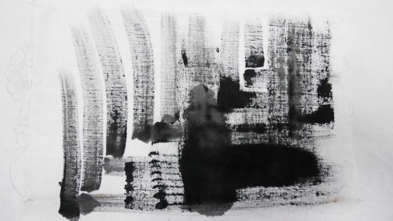 もう一つやってみる。四角い布の切れ端に水墨画風なオタマジャクシのようなものを描く。