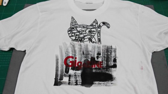 そこに赤の布用インクでロゴも刷ってみたところいい出来栄えではあるが、同じものを失敗なしにTシャツに描くことができるとは限らない。