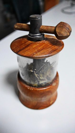 葉っぱの状態ではあまり香りがしないので木製の手挽きペッパーミルを使うことにした。
