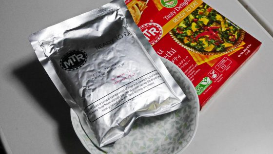 パウチから出してみるとじゃがいもと唐辛子と何やら水菜のような野菜が見える。この葉っぱらしきものがフェヌグリークリーフというものらしい。