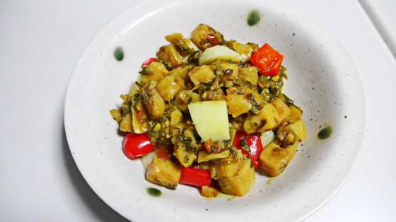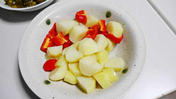 赤ピーマンとじゃがいもをレンチンしたものを追加することにした。