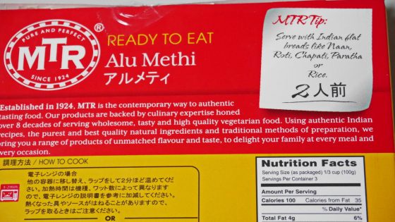 300g入りである。原材料は、野菜・果実(ばれいしょ、フェヌグリークリーフ、玉ねぎ、トマト、コリアンダーリーフ、にんにく、生姜、グリーンチリ)、香辛料、ヨーグルト、食用ひまわり油、食塩。