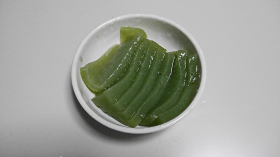 コンニャク独特のアクがまったくない上にツルッとした食感と青のりの風味がなんとも言えずよく調和していて、刺し身の名にふさわしいコンニャクである。