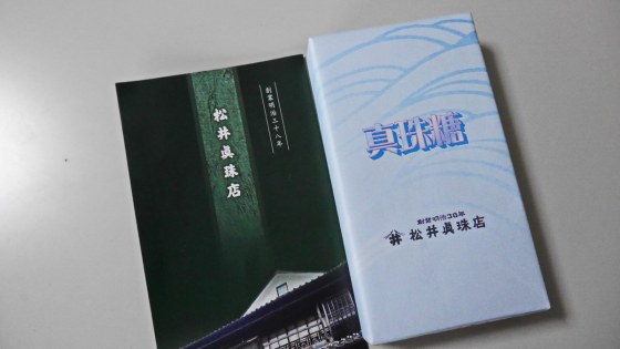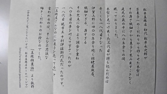 松井真珠店の初代の茶菓子へのこだわりから作らせた木型を3代目が見つけ18代目に至って実現した曰く因縁付きの干菓子である。これが真珠屋さんがお菓子を売っている記念の理由である。