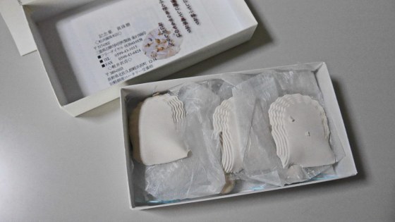 真珠貝の端っこが非常に薄いので所々欠けている。これは一つずつ包装する必要があるのではないかと思われる。この干菓子を見た人は誰もすぐに食べようとは思わないであろう。まさに「佇む」のである。そんな不思議な繊細さのあるお菓子である。口に入れるとスーッと溶けていく。人魚姫が泡となって消えていくイメージがふと浮かぶ。