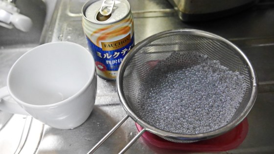 そのミルクティーの中へバジルシードを入れる。タピオカは沈むが、バジルシードは浮く。ミルクティーの表面に浮かぶのでよく見える。
