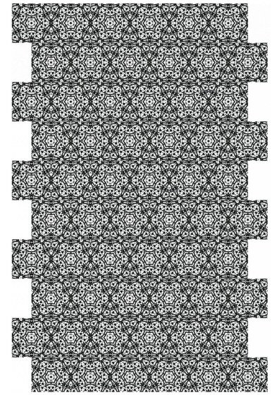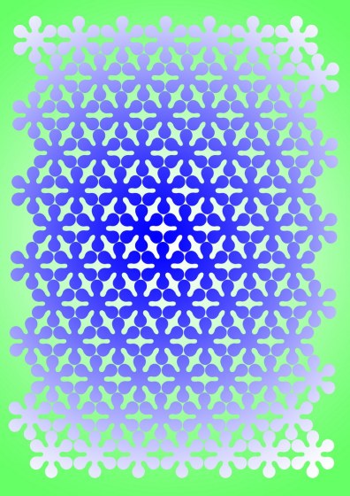 10年ほど前からPCでパターンを作るのがたやすくなった。6角形の雪のパターンを並べると思いがけない形が見えてきて面白い。これは昔から日本で使われている雪の紋で「はつゆき」と呼ばれている。日本の雪の結晶の形は非常にシンプルな抽象形である。
