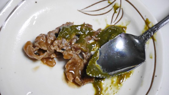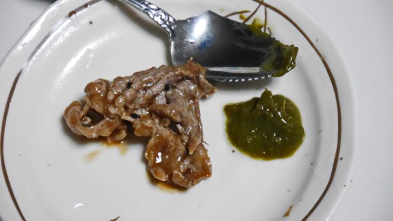 カレー味にしたお肉をひとつまみ取り上げて瓶の蓋についたミントチャツネをスプーンで掬って用意する。