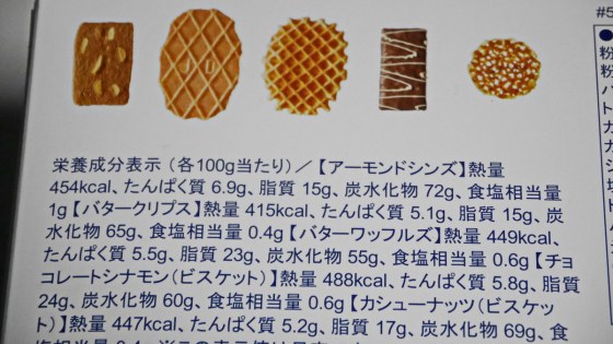 5種類のクッキーが入っている。アーモンドシンズ、バタークリスプ、バターワッフル、チョコレートシナモン、カシューナッツの5種類である。この会社はベルギーワッフルで有名である。