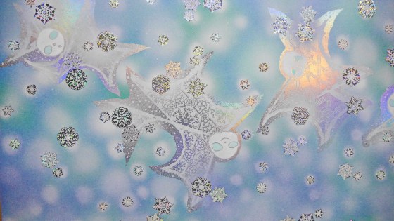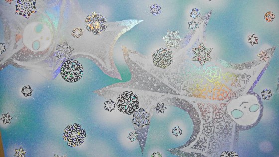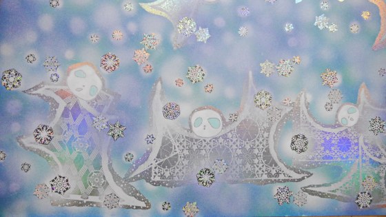 私も、雪が降るように雪ん子たちにお願いした。雪ん子たちは絵の中で雪乞いの舞を舞ってくれた。その御蔭かどうかは知らないけれど雪がちょっぴり降ってきたので、困った時の神頼みも捨てたものじゃないと思う。