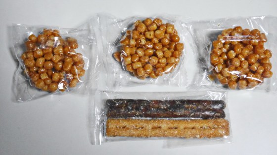 かりんとう。細長いのは鬼の金棒かな。丸いかりんとうは、太鼓のように思える。