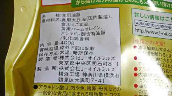 日本唐揚協会認定の味の素が作った「から揚げの日の油」は油がもれるというので回収になったそうであるが、息子がかった油のパッケージはなんともないので使うことにした。