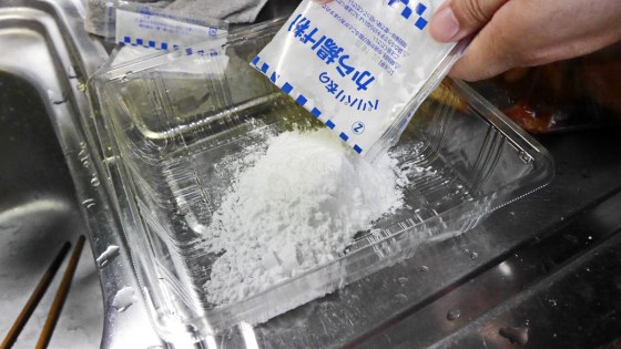 から揚げ粉をポリの入れ物に入れる。