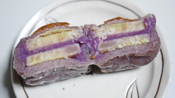 サツマイモで紫芋あんをはさみ、小麦粉の生地で包んで蒸した団子である。