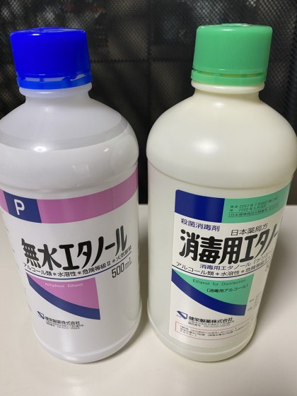 近所のダイコクドラッグの店頭に何と無水アルコールが置いてあった。新型コロナウィルスの感染で消毒用アルコールも売り切れ状態なのになぜ無水アルコールが売れ残っているのか不思議であった。