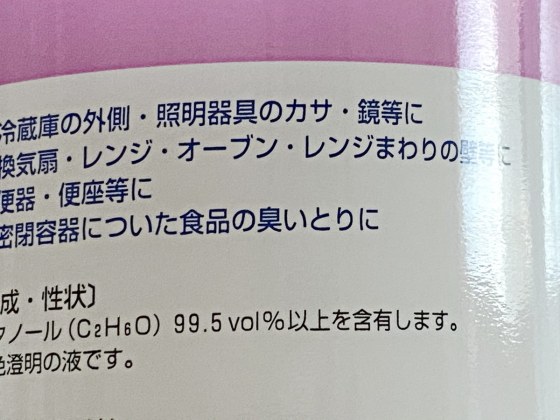 容器に貼ってある説明書には、濃度は99.5%で、消毒用とは書いていないのは、これで手指を消毒するのにはほぼ無害であるが、飲んだりすると濃度が高いため急性アルコール中毒を起こすためである。