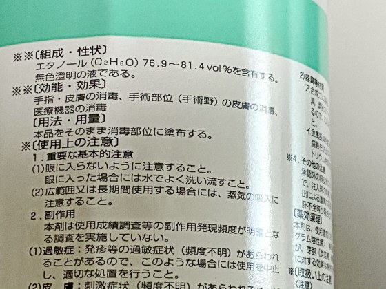 売れ残っていた理由は、無水エタノールは消毒用アルコールではないと思いこんでいる人がかなりいたためである。まず、エタノールという言い方がよく解らないらしい。それでも消毒用と書かれていると、消毒用のアルコールらしいと思うと、店で会った人が言っていた。