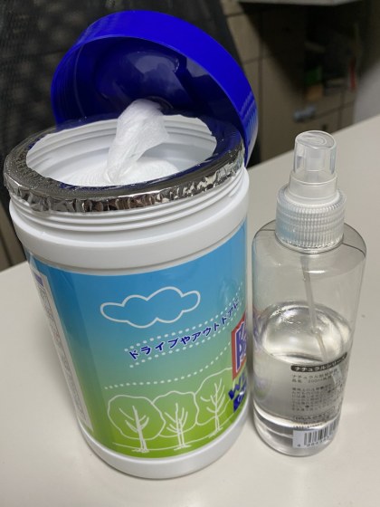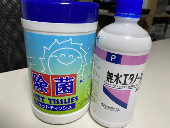 そこで登場するのが無水エタノールである。何しろ、この除菌ウェットティッシュは水分が多いので普通の消毒用アルコールでは薄まってしまう。ウィルスを殺すのにはエタノールの濃度は70~80%でなければならない。ウェットティッシュにどれぐらい水分が入っているのかわからないけれど、無水エタノールを加えることでアルコール濃度を上げるのである。