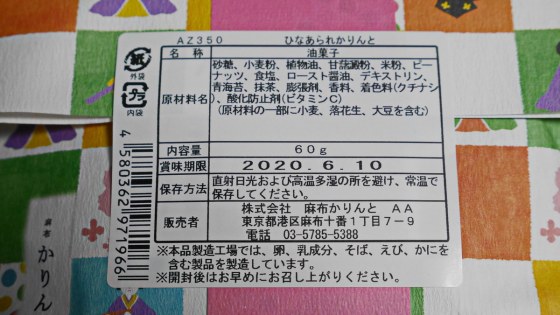 「麻布かりんと」の「五色ひなあられかりんと」が宅急便で届いた。