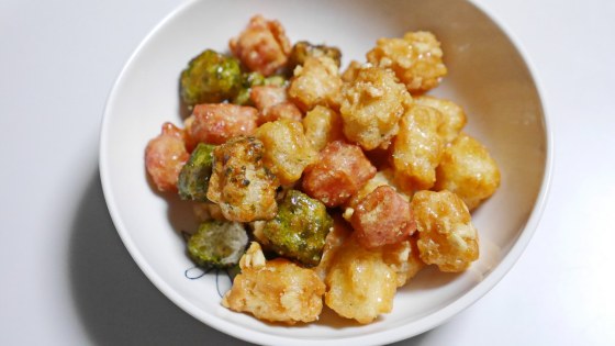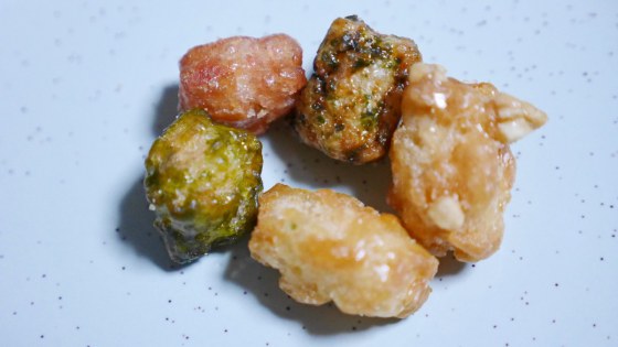 ピーナッツ、ロースト醤油、青海苔、抹茶はわかるが、赤い色の甘いかりんとが何味なのかよく分からない。