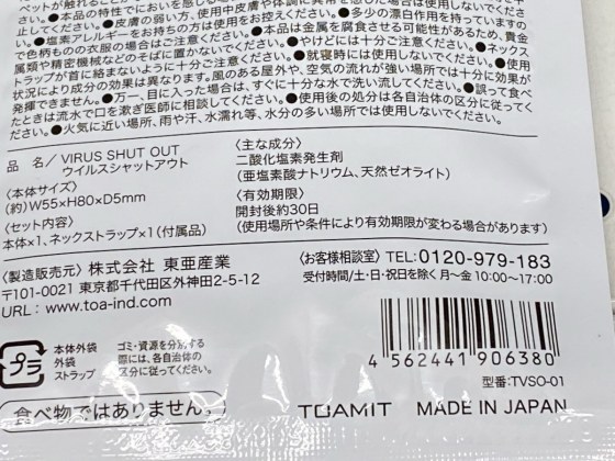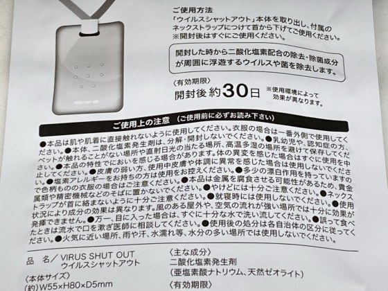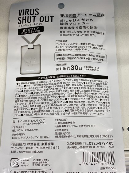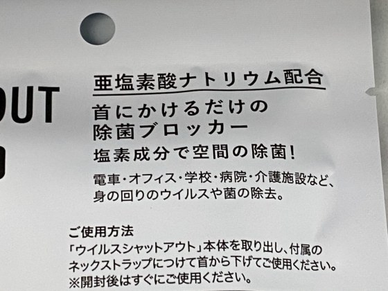 液体だと思っていたらつぶつぶの個体である。「亜塩素酸ナトリウム配合・首にかけるだけの除菌ブロッカー」と書かれてある。ネックストラップで首から下げるのである。