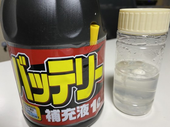 自動車のバッテリー水は精製水だからこれを使う。キサンタンガムに精製水を加える。ほとんどの増粘剤は簡単には水に溶けないので、1昼夜、蓋をして放置しておくと朝には一応溶けているので、混ぜて均一にする。