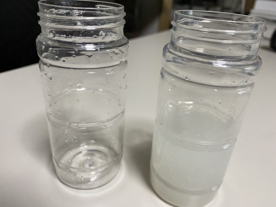 これを元の空き容器に入れる。時間とともに気泡は少しずつ消えていく。