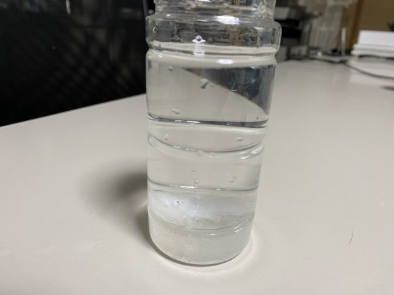 底の方に沈んでいるのがキサンタンガム水溶液でなかなかアルコールと混じらない。