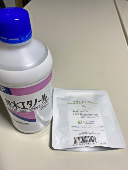 4グラムのキサンタンガムの粉末を30倍の精製水に溶かせば良い。精製水がなければ水道水で構わない。なぜならアルコールをドバっと入れるから細菌が増殖する心配はないから大丈夫である。