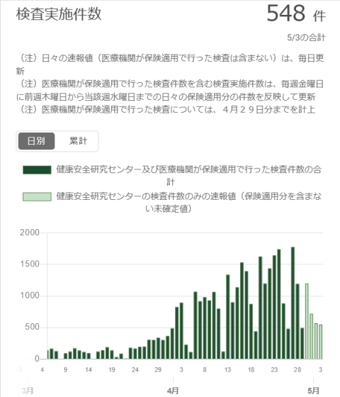 連休に入って以来、感染者は減っているが、「感染者率」は飛躍的に上がっている。しかし、驚くことはない。これらのデータは最新の状況を表した時間軸に沿ったデータではない。これらのデータから日本の現況や未来を判断することは出来ない。それにも関わらず、TVで「ここ3日間の感染者の数は100人を下回っている。」なんてことを報道すれば、国民は「自粛生活は効果を表しているのだ。」と勘違いしてしまう。実際は、連休で公共機関はお休みなのだ。勿論、検査機関もほとんどお休み。検査数が減れば感染者数も減るのは当たり前。しかし、それにも関わらず、感染者率は上がっている。政府は緊急事態宣言をこのまま5月末まで延長するらしいが、データを見つつ、自粛は緩めてゆく方針。こそっとスウェーデン方式をとりつつ、国民にはいい顔してパンデミックを政治の道具に利用して憲法改正をやるつもりなのか。