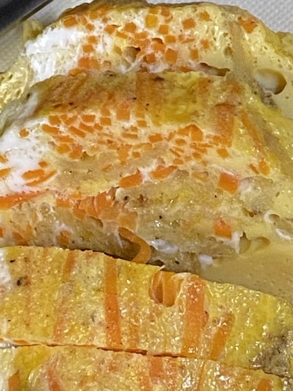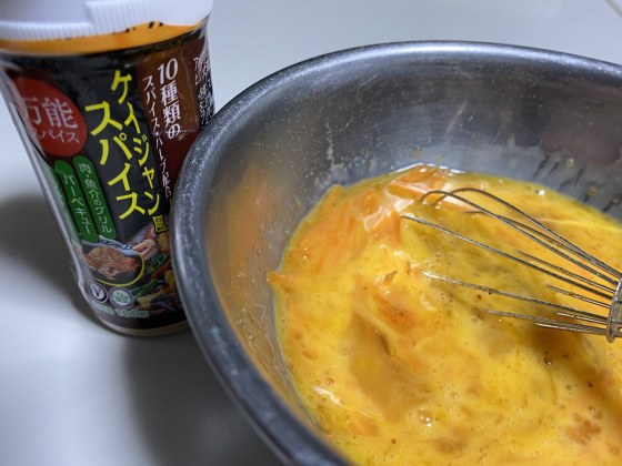 卵に人参の千切りを加えて、業務スーパーで買ったケイジャンスパイスを入れてさっと混ぜる。あまり混ぜると卵の腰が無くなる。更に好きなハーブ類を加えても良い。