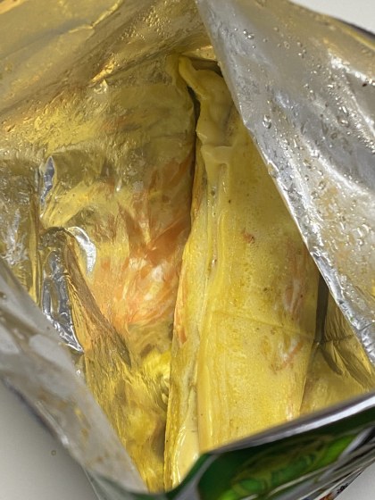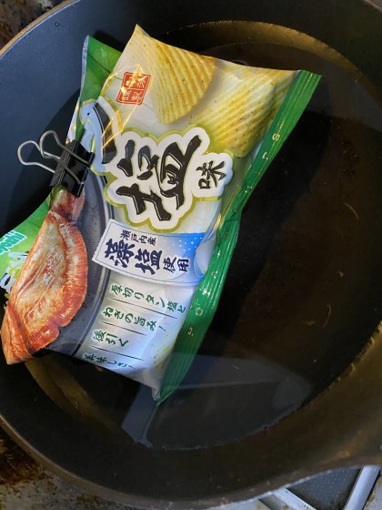 後で本当のじゃがいもを使って袋だけを利用して作ってみた所、10倍ぐらい美味しかった。結論から言うと、必要なのはこのポテチのアルミの袋だけであった。