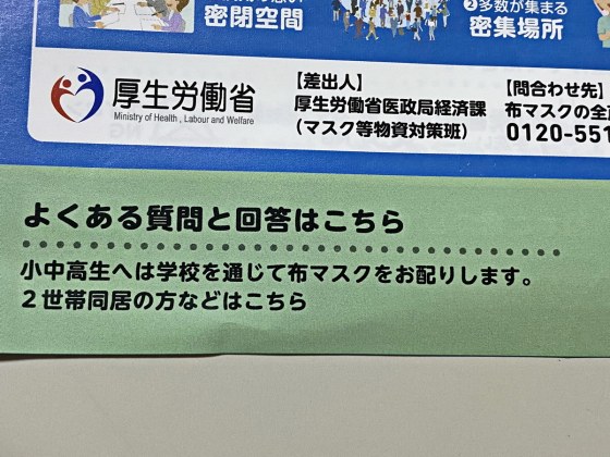 1世帯、2枚ずつだが、小中高生経は学校を通じて布マスクを配布するらしい。