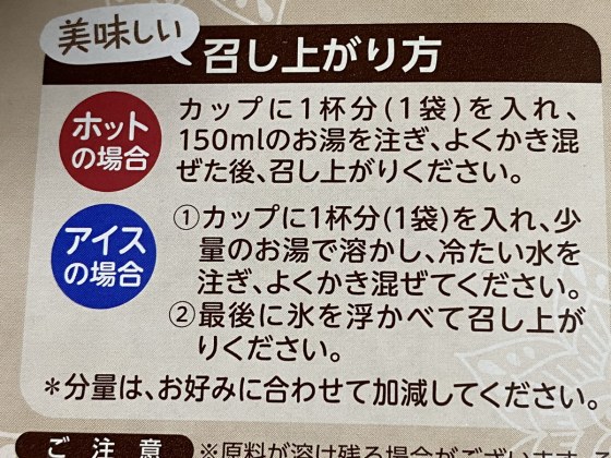 アイスでもホットでもOKだというのはいいが、一袋に月150ミリリットルの水というのは少し甘すぎるのではないか。
