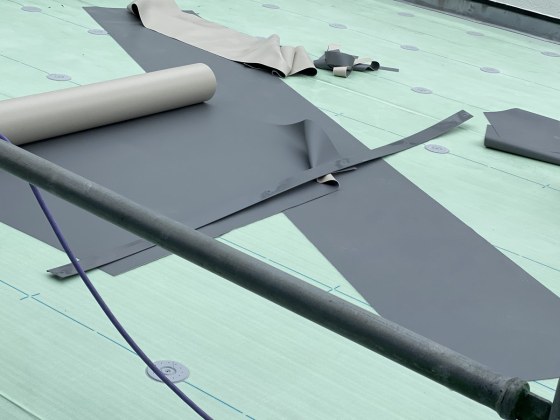この上に、塩ビのグレーの分厚い防水シートを貼っていく。