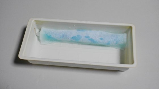 シートの端が浸たる程度に容器に水を入れて暫く待つ。時間は乾燥程度によるので時々濡れ具合をみるようにする。