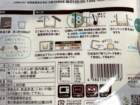 そのブレンドした粉に水を加えてこのパックのままよく混ぜてレンチンするだけという手間ををかけないインスタント蒸しパンである。粉80グラムに水80CCを加えて袋の端までよく混ぜてそのままレンチンして作ってみたが、なんともまずいものが出来上がった。