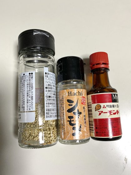 味を修正するために、白ごまとシナモンとアーモンドのエッセンスをくわえる。