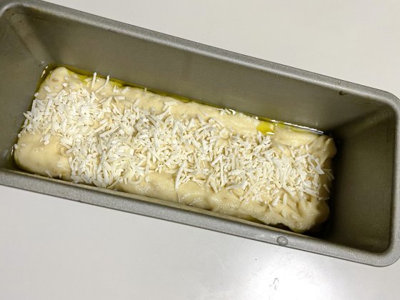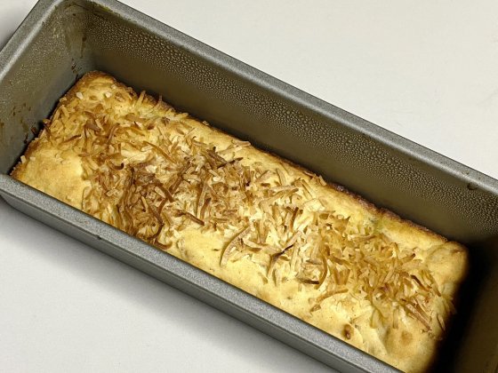 よく混ぜたものをテフロンの型に流し込み、上にココナツフレークをドッピングする。