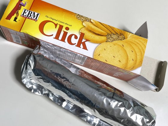 パキスタンのこのクミンビスケットは箱入りであるアルミフィルムの袋に入っている。