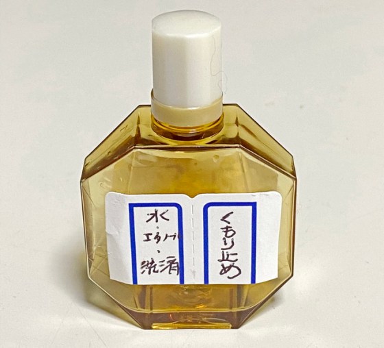 上記の場合、水1リッターに稀釈したが、本曇り止め剤は混合物質の比率が重要であり、水による希釈量は任意である。この場合、水による希釈量に実用上の制限があるが、この例示の濃度は曇り止め剤の保存性及び安定性からみて、最適な濃度の数量である。例示の成分の濃度組成を持つ溶液の全体は、使用時には曇り止め剤としての機能を有する限り、任意に水で希釈して使用することができる。