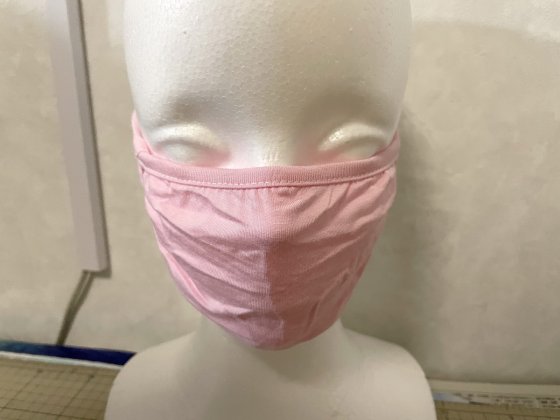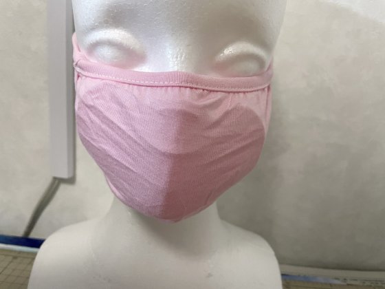 このピンクのペラペラのマスクは、伸縮性は高いが顔に密着してしまう。口を動かすとその印影がもろに出る。