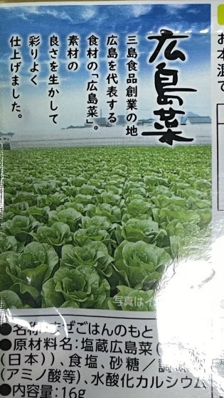 袋の裏を見ると、広島菜を使っているから「ひろし」という名前だとわかった。ただ、広島菜が一体どんなものかわからない。写真を見るとずいぶん大きな葉である。調べてみると、広島菜というのは日本三大漬け菜の一つだそうである。しかし、スーパーの棚に広島菜が並んでいるのを見たことがない。