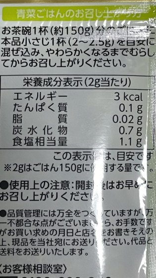 この青菜のご飯の素は乾燥してぱりぱりなので、ご飯と一緒に蒸らして食べると良いと書かれている。お茶漬けや雑炊などもしてみたが結構おいしい。青物が少ない病院食のフリカケに向いている。何にでも使えるところが気に入った。