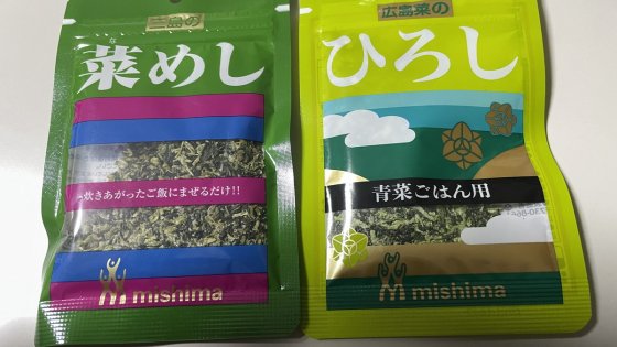 「菜めし」はお気に入りで常に備蓄しているが、「ひろし」とどうちがうかというと、その原材料を比べてみればよく分かるが、「ひろし」の方が混ぜ物がすくなく広島の地元の広島菜を使っていて純粋なのである。見た目も「ひろし」は細かく刻んであるが、「菜めし」の方はもう少し大切りで混ぜ物も多い。